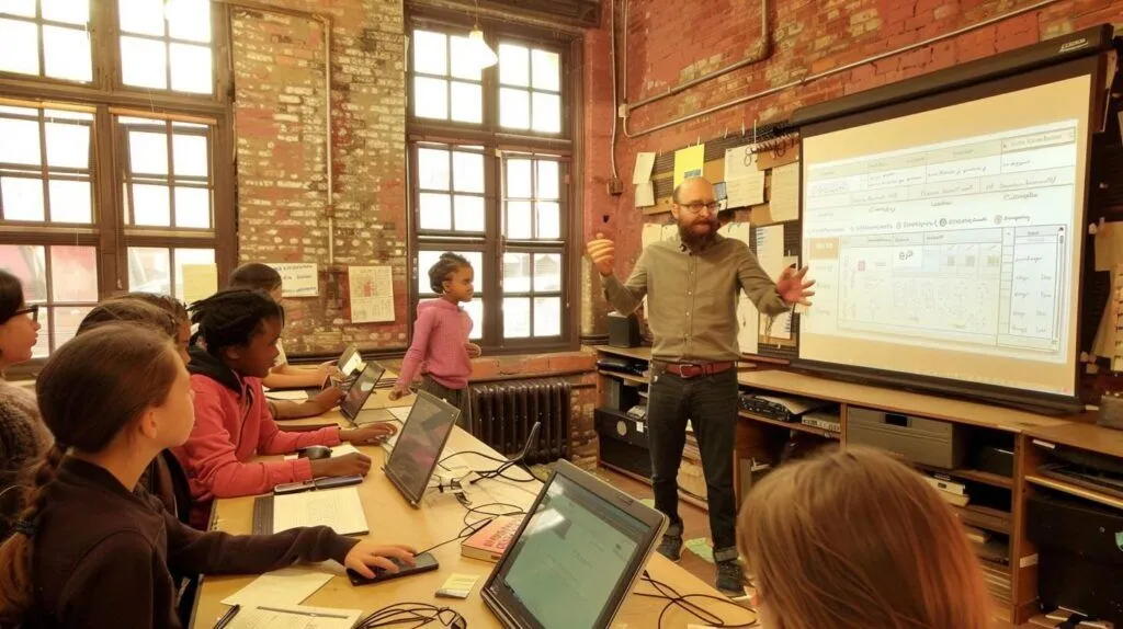 photo of a kind and gentle male teacher with a small group of students giving support and offering advice in a classroom setting