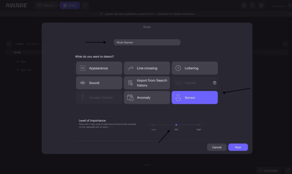 Step 9: Click “+” on the right-hand side of the screen to create a new rule, name the rule, select “Sensor”, set “Importance Level”, and click “Next”
