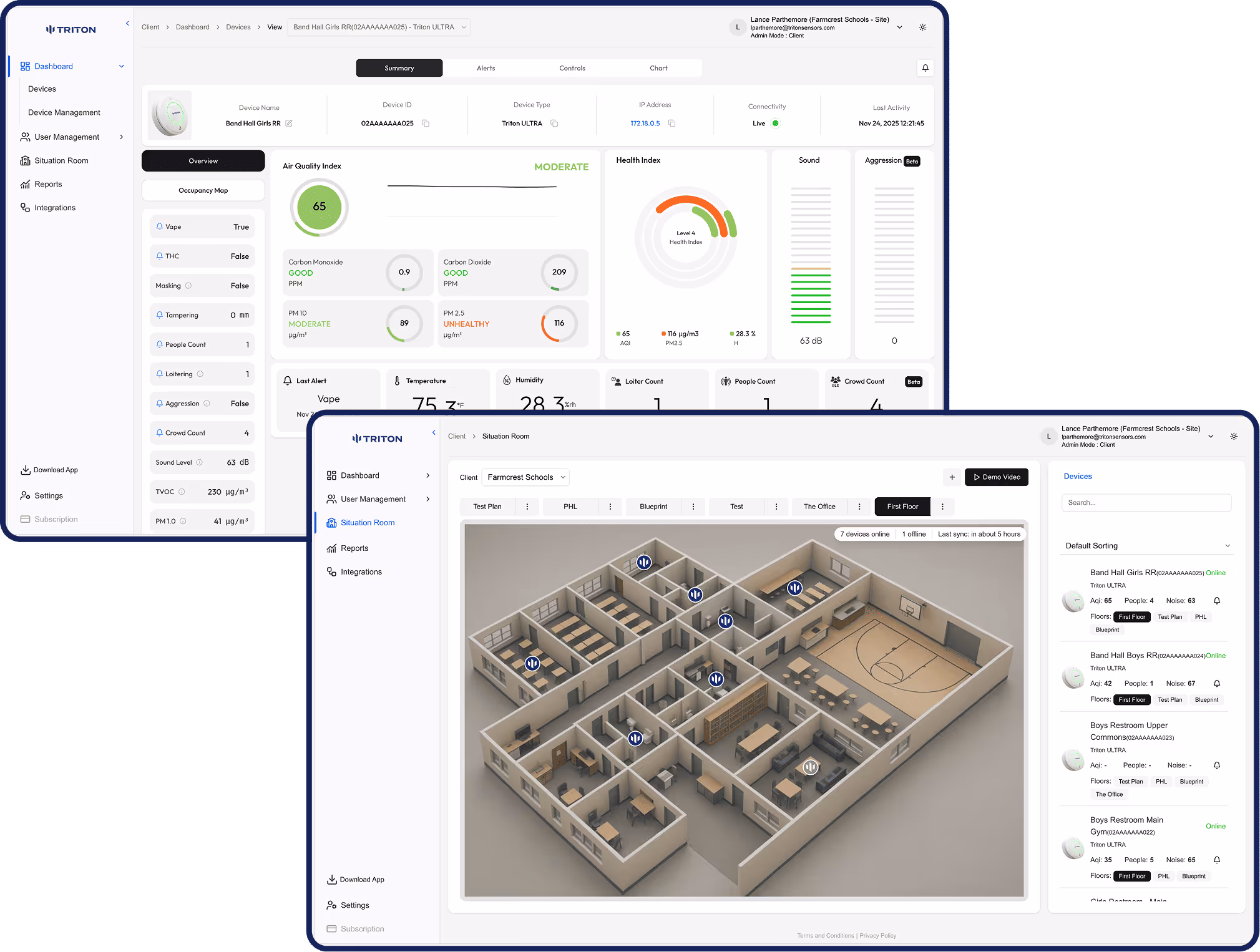 While Triton leads the market in vape detection accuracy and speed, its features goes way beyond drug detection. Contact us to learn how thusands of customers have solved other critical needs in their private spaces with the only sensor to include built-in radar analysis.